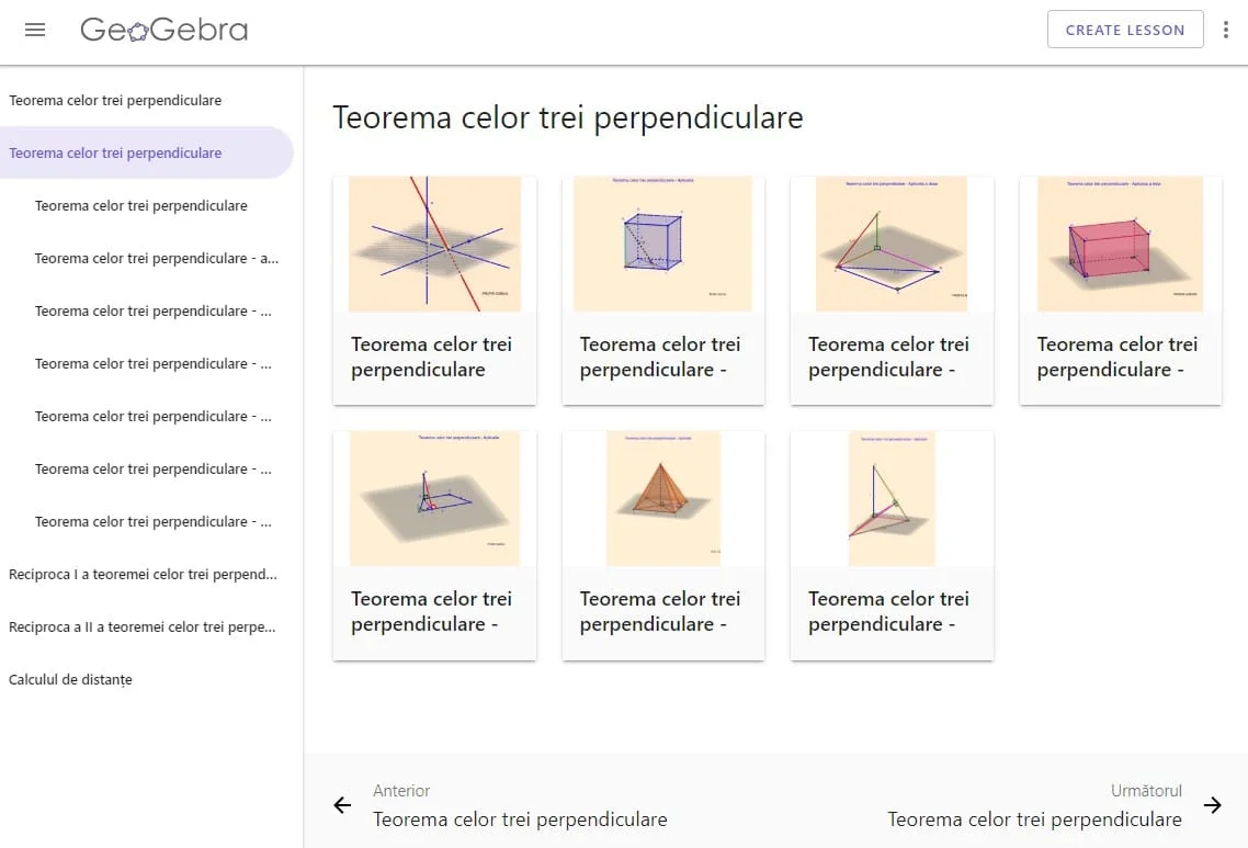Sunt 16 aplicații interactive: prezentarea teoremei, demonstrația și mai multe probleme în care să identifice teorema celor trei perpendiculare. În probleme, elevii pot vedea demonstrația, pot schimba valorile laturilor și ale înălțimilor (după caz).